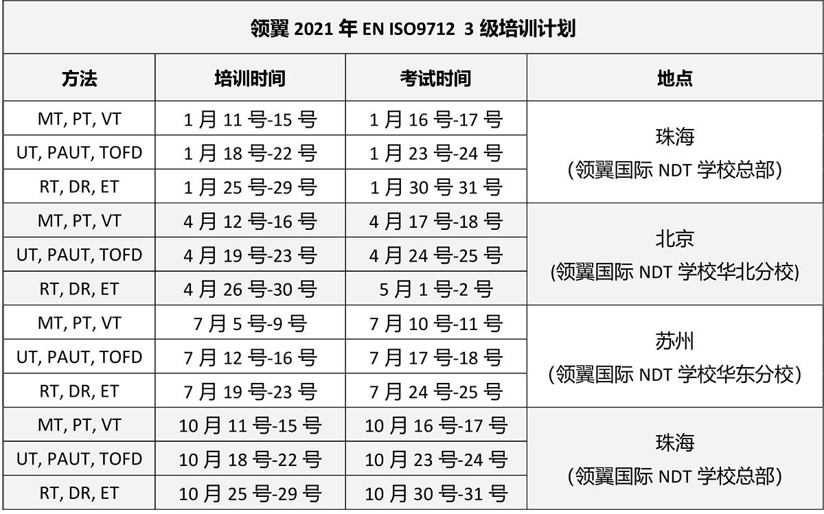 为满足国内制造企业欧标EN ISO9712人员认证需求,领翼国际NDT学校成功取得欧洲认证机构C-WT的授权,2021年在国内继续开展符合欧标EN ISO9712资质的无损检测人员培训和考核工作。