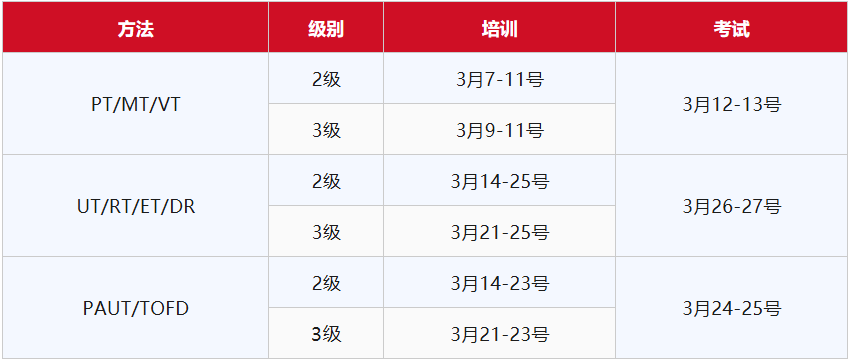 2022年3月培训和考核的方法有:渗透检测(PT)、磁粉检测(MT)、超声检测(UT)、射线检测(RT) 、数字射线检测(DR) 、涡流检测(ET)、目视检测(VT)、相控阵超声检测(PAUT)和衍射时差法超声检测(TOFD),共10种无损检测方法和技术2级和3级课程。