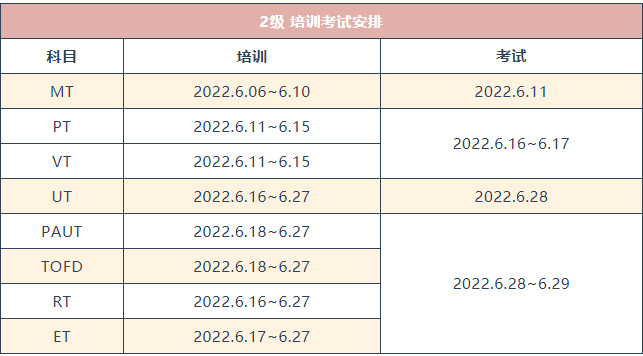 6月主要开展渗透检测(PT)、磁粉检测(MT)、超声检测(UT)、射线检测(RT)、涡流检测(ET)、目视检测(VT)、相控阵超声波检测(PAUT)和衍射时差法(TOFD),共8种方法的2级和3级的培训和考试鉴定工作。