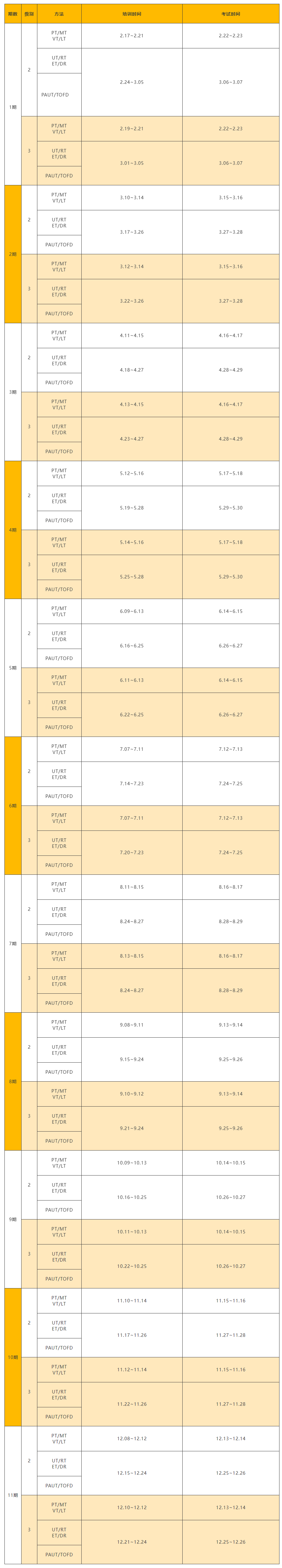 2025年培训和考核的方法有:渗透检测(PT)、磁粉检测(MT)、超声检测(UT)、射线检测(RT) 、数字射线检测(DR) 、涡流检测(ET)、目视检测(VT)、泄漏检测(LT) 、相控阵超声检测(PAUT)和衍射时差法超声检测(TOFD),共10种无损检测方法和技术2级和3级课程。