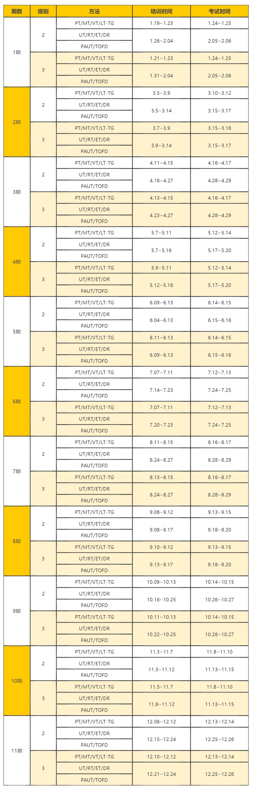 2025年培训和考核的方法有:渗透检测(PT)、磁粉检测(MT)、超声检测(UT)、射线检测(RT-Film) 、数字射线检测(DR) 、涡流检测(ET)、目视检测(VT)、泄漏检测(LT-TG) 、相控阵超声检测(PAUT)和衍射时差法超声检测(TOFD),共10种无损检测方法和技术2级和3级课程。